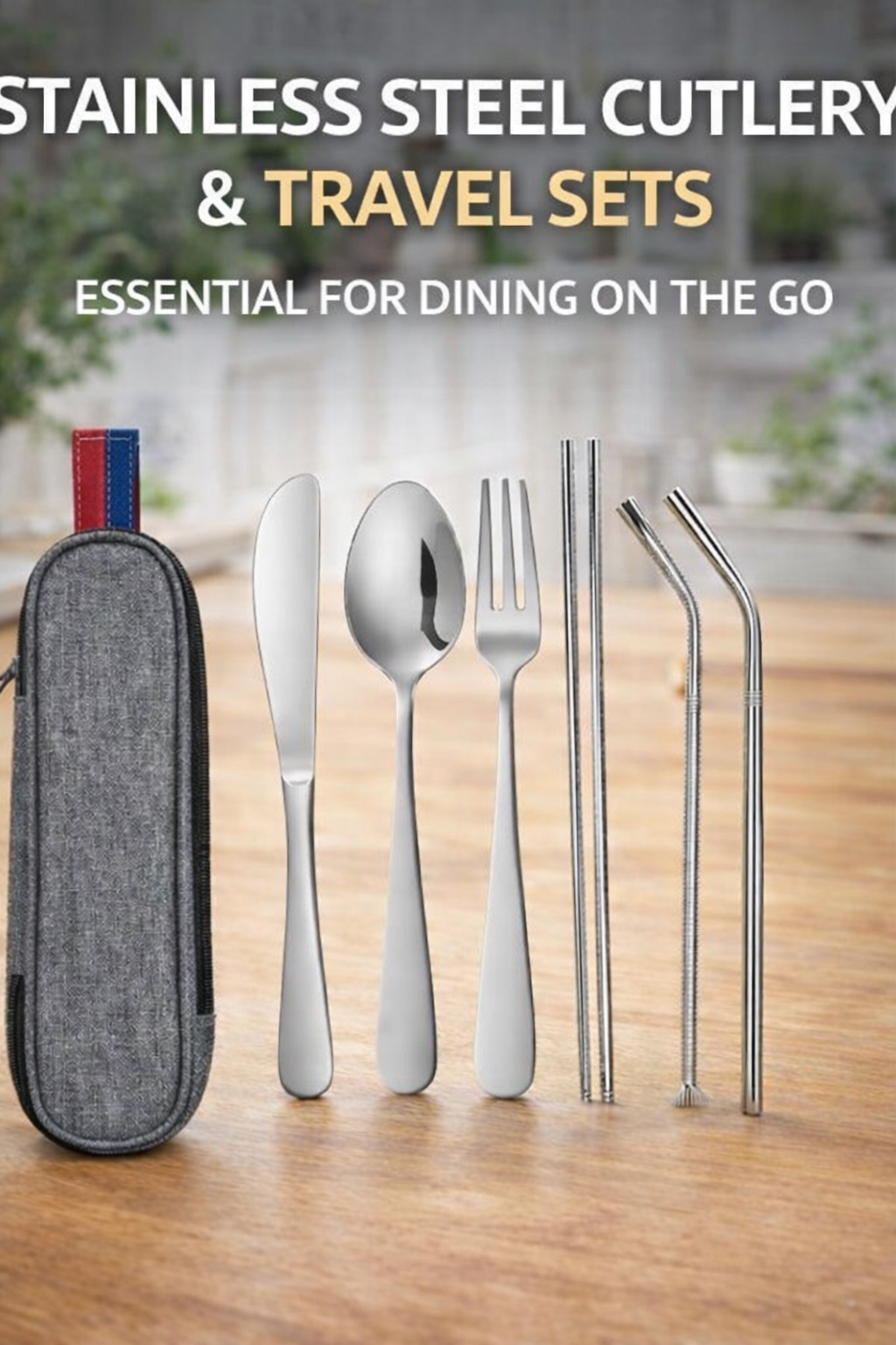 6pc Flatware Set- Set includes a Fork, Spoon, Butter Knife, Straw, Chop Sticks and storage bag (available in Silver, Gold, Black, Multi-color)